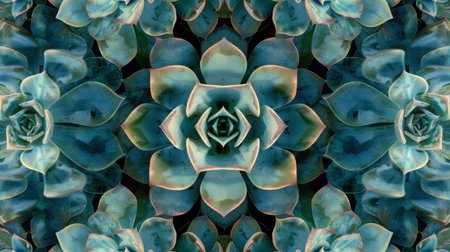 A vibrant, close-up image of succulent plants with overlapping, teal-colored leaves. The image has a mirrored effect, creating a symmetrical and geometric pattern.