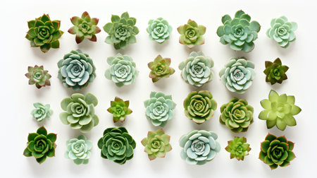 An overhead view of a variety of succulent plants arranged in rows on a plain white surface. The succulents are all in different shapes and sizes, showing their unique textures and colors.