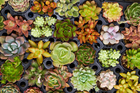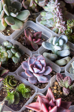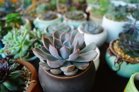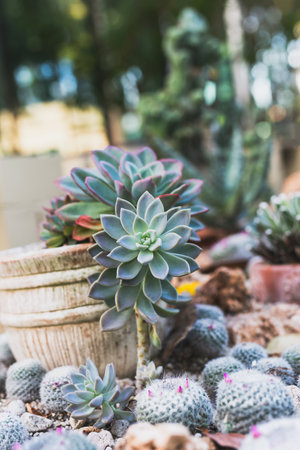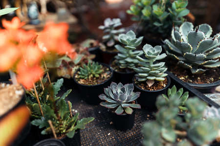 Succulent plants and cactus in pots for sale in street market. Blurred Background. Close-up. Selective focus.