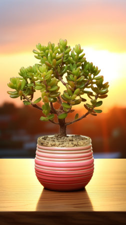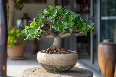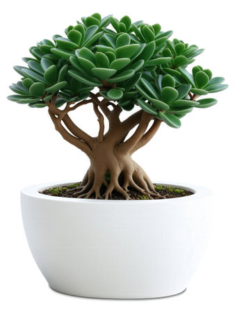 Jade Plant (Crassula ovata) Thick, oval-shaped green leaves with a glossy finish in a ceramic bonsai pot, a rustic terracotta