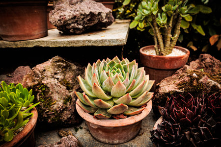 Sempervivum arachnoideum grow in a red pot in cacti rock garden. Small succulents growing on backyard. Gardening and succulent plants care. Greenhouse