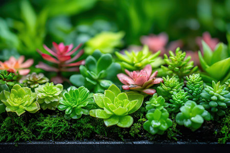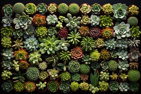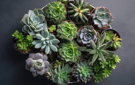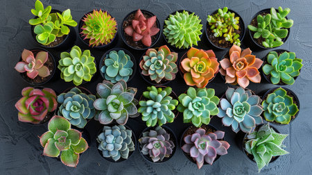 A captivating top view of colorful succulents arranged in a symmetrical pattern. This image highlights the diversity and beauty of succulent plants, perfect for gardening and nature enthusiasts.