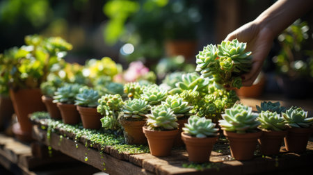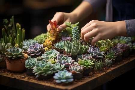 Women gardeners hand replanting cacti and succulents, Generative AI