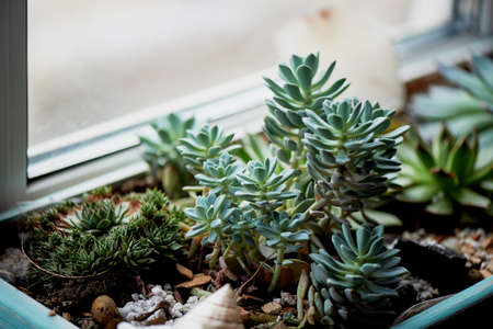 A group of miniature juicy flowers in a ceramic pot in the form of a house on the windowsill. Close-up of the green tops of the echeveria plant. Flowering Indoor Plants. Succulents.