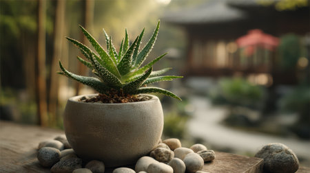 Aloe vera in a pot with a matte finish, surrounded by pebbles, zen garden aesthetic, soft diffused light