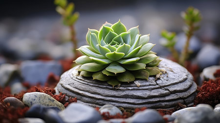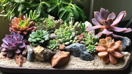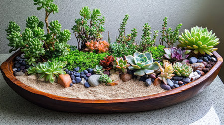 Dry tray garden with miniature rocks and succulents in a harmonious design, a blend of earthy colors and textures