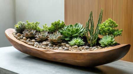 small succulents arranged in a symmetrical pattern fill a wooden bowl, creating a captivating display against a clean white background. this artistic composition, reminiscent of traditional chinese landscapes, features succulents in shades of light maroon and emerald, resembling polychrome sculptures. this associated press photo showcases the beauty of these stone-like plants, evoking a sense of tranquility and balance. ai generated
