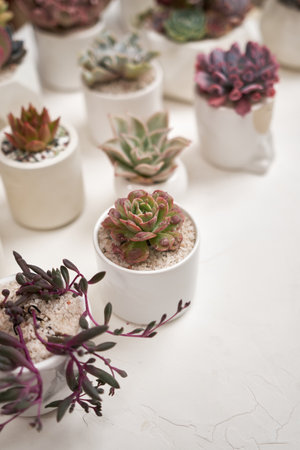 Echeveria Succulent house plant in a pot and other potted house plants on a table