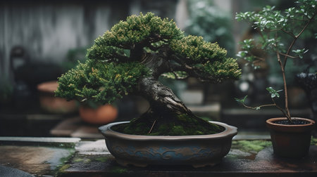 Beautiful bonsai plant display in a ceramic pot indoor.