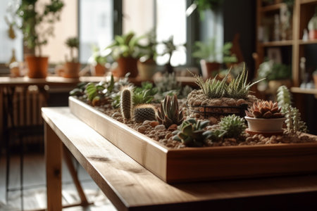 Cacti and succulent plants growing in a planter on a table in room with a lot of house plants. .Created with Generative AI