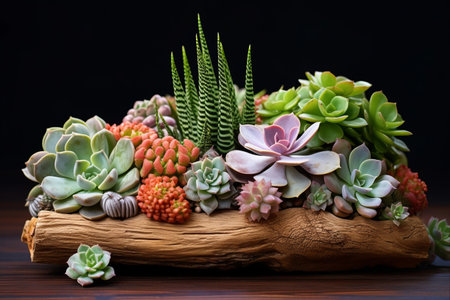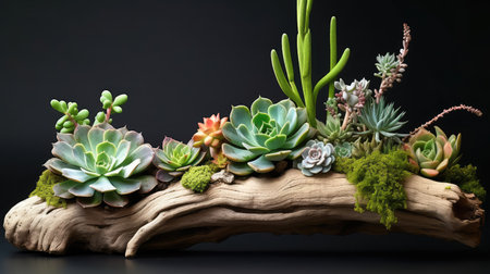 Heavenly Harmony: A Close-Up of an Artistic Succulent and Cactus Arrangement Adorning a Clay Pot on a Rustic Log