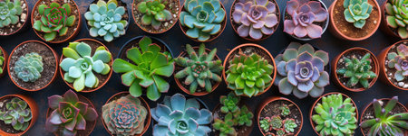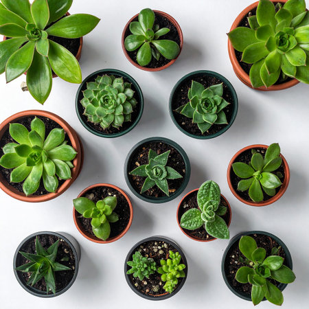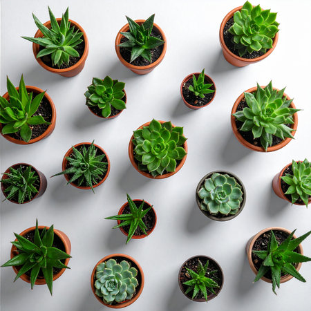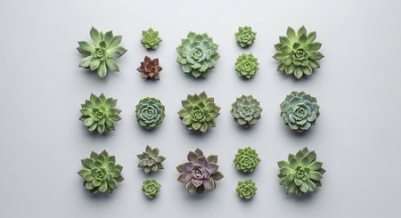 A top-down view showcases a collection of various green succulent plants neatly arranged in rows on a plain white background, highlighting their...
