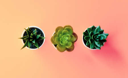 Mix of artificial green succulents on warm peach color backgrounds.