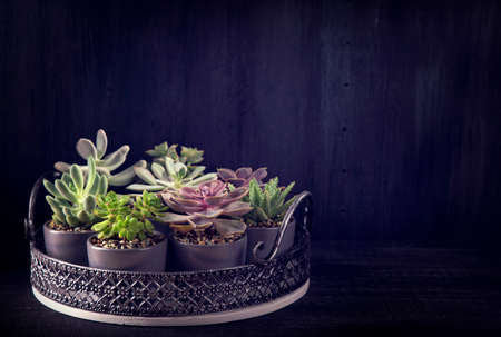 Different succulents above the black wooden backgriund