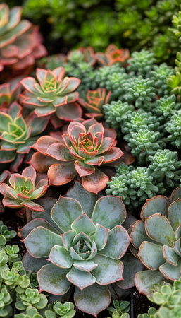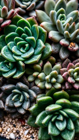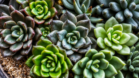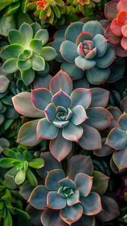 Close-up of succulent plants in varied colors, highlighting their unique shapes and textures. Perfect for gardening, nature, and botanical themes.