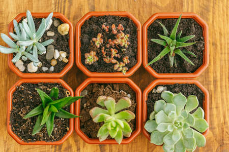 Variety of succulents on the ground top view