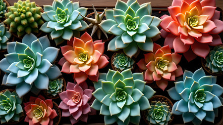 An arrangement of various pastel-toned succulents creates a vibrant botanical display.