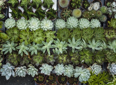 Many potted succulents of Echeveria elegans, Echeveria, Sedum,Graptopetalum (leatherpetal) at a flower market