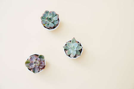 Three tiny succulents in white pots on light beige background. Scandinavian style interior decoration