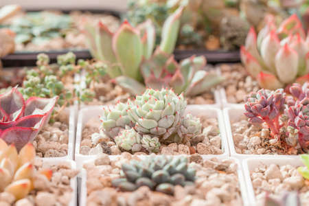 Succulents or cactus in desert botanical garden with sand stone pebbles background. succulents or cactus for decoration and agriculture concept design.