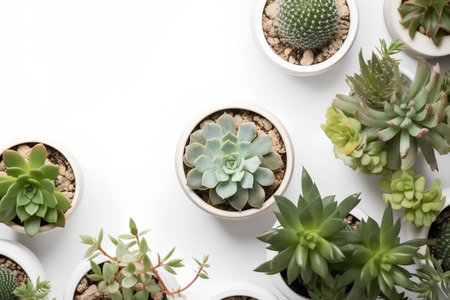 Top view of various succulents in white pots on white background