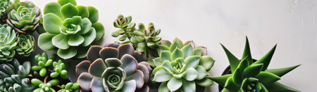 Succulents mix banner, floral frame flay lay with copy space for text on white concrete background, for plants stores.