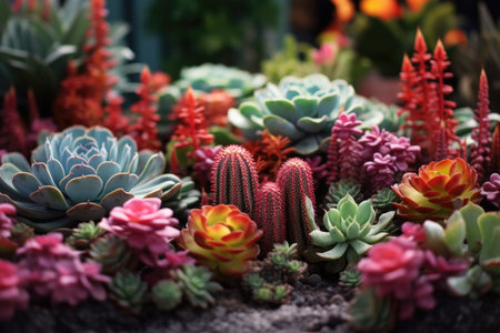 A lush garden filled with diverse succulents showcases rich green tones and vibrant yellow and red flowers. The arrangement highlights unique shapes and textures, creating a peaceful atmosphere.