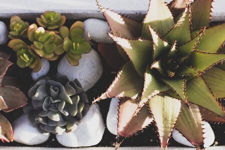 Rectangular arrangement of succulents, cactus succulents in a planter, above view, toning