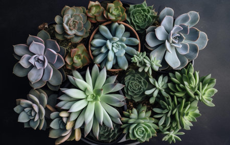 Top view of various succulent plants in pots on black background.