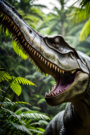 A detailed close-up view of a dinosaur with its mouth wide open. This image can be used to depict prehistoric creatures, dinosaur exhibitions, educational materials, or for adding an element of adventure to creative projects.