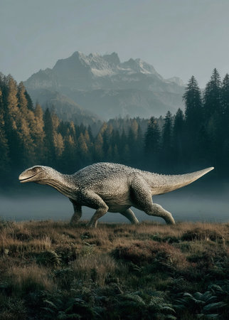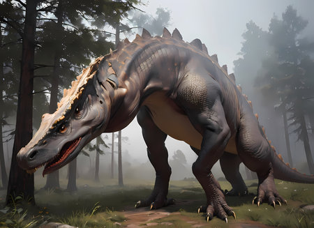 This captivating image features a dinosaur poised in a dense, prehistoric forest filled with ferns and mist, showcasing lifelike details and vibrant colors.