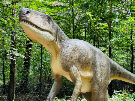 DINO PARK, KHARKOV - AUGUST 8, 2021: Day view of beautiful Dinosaur sculpture display in the park. The prehistoric animals ever lived on earth million years ago.