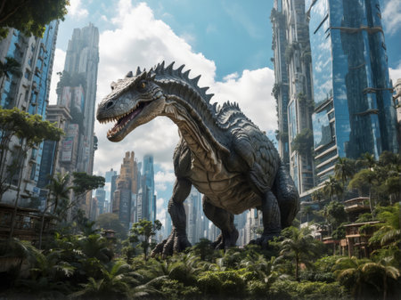 Fantasy 3D rendering of a Dinosaur in the middle of a modern city.
