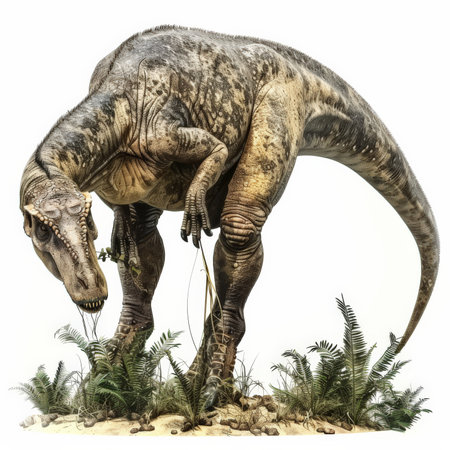 A detailed Edmontosaurus with its duck-billed mouth and robust body, grazing on vegetation, isolated on white background.