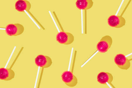 Creative pattern made with bold pink lolly pops on bright yellow background. Sweet happy life idea. Fun colorful concept with lolly pop.