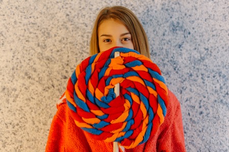 The close-up portrait of the young teenage girl hiding the part of the face behind the lollipop pillow.