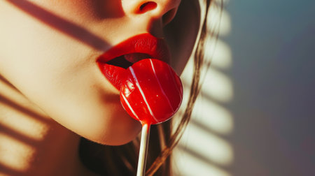 Close-up of beautiful girl's lips holding lollipop. Light background. Strong shadows. Aesthetic concept. Generative AI.