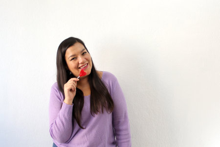 Latin adult woman with red lollipop in the shape of a heart excited to celebrate with her partner friends family February Day of Love and Friendship San Valentin