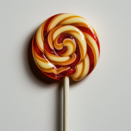 This vibrant swirl lollipop showcases rich colors and a spiral design, making it an ideal representation of sweetness and joy for dessert and candy themes.