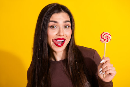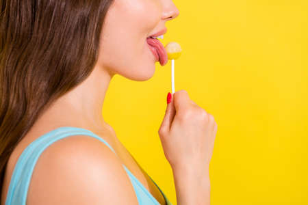 Cropped profile side view portrait of attractive girl licking lollipop isolated over vivid yellow color background