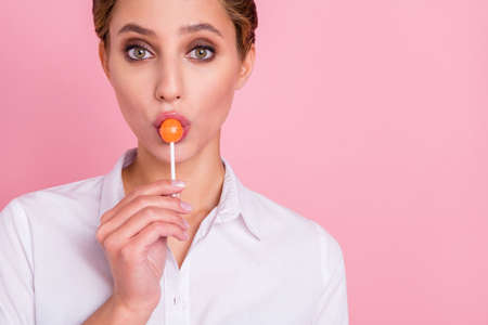 Photo of young happy charming woman eat candy lollipop good mood copyspace isolated on pink color background