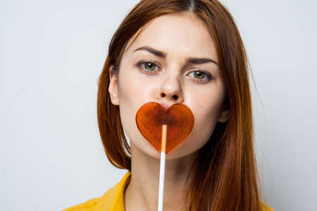 Woman with lollipop, sweets, tasty, woman with heart on stick, woman on light background portrait.