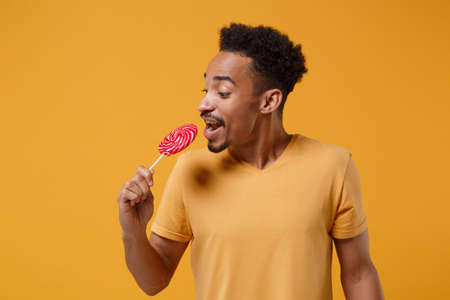 Funny young african american guy in casual t-shirt posing isolated on yellow orange wall background studio portrait. People sincere emotions lifestyle concept. Mock up copy space. Hold round lollipop.
