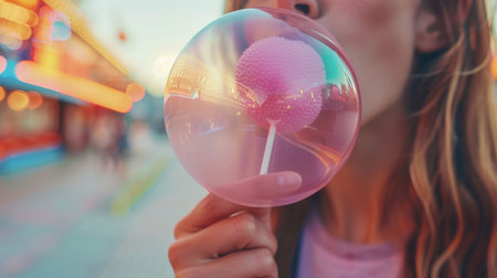 Girl blowing a big bubble with pink bubblegum in Amusement park.