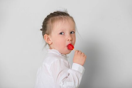 Cute little girl in white shirt sucks red Lollipop. On white background. Horizontally framed shot.