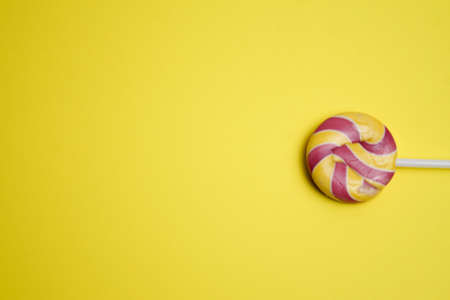 Multicolored round lollipop on a bright yellow background. Copy space . Valentines day.