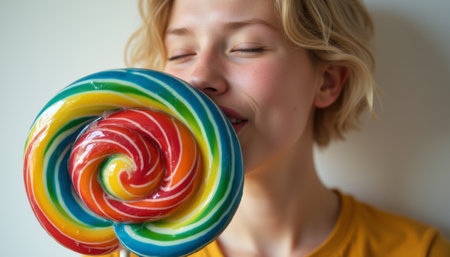 A cheerful young girl with short blonde hair playfully poses with a vibrant, swirled lollipop, her eyes closed in delight. The image captures the essence of childhood joy and sweetness, highlighting the colorful treat that brings a smile to her face.
