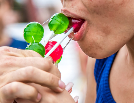 Six candy candy on a stick in the mouth of a girl