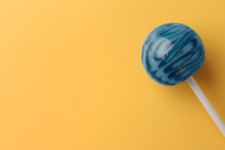 Tasty lollipop on orange background, top view. Space for text