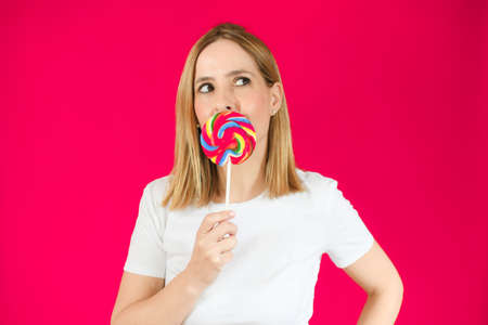 Sensual beautiful young woman lick lollipop on studio background. Beauty, fashion. Cosmetics, make-up. Portrait of sexy woman.